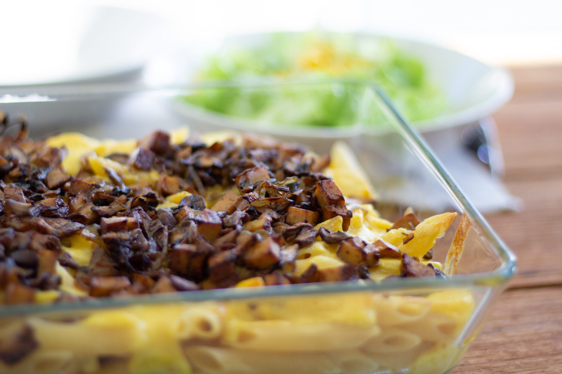 Als Topping auf die „Käsenudeln“ geben und für etwa 15 Minuten im Ofen überbacken.